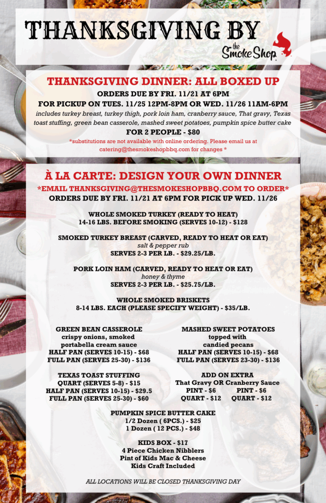 Call 857-449-1980 or Email us thanksgiving@thesmokeshopbbq.com